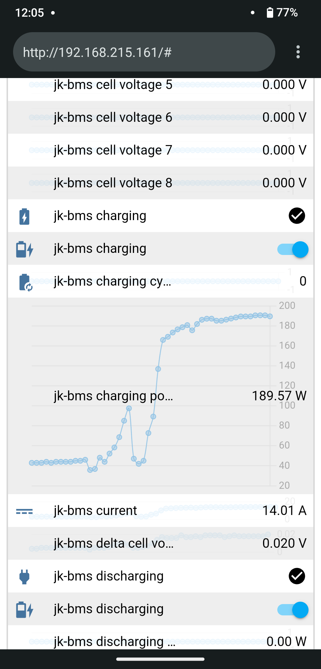 ^Cme@x220 ~ $ mosquitto_sub -h 192.168.100.117 -u pv -P Offgrid -t jk-bms/number/jk-bms_max_charge_current/state 40.000000 ^[[A^[[D^Cme@x220 ~ $ mosquitto_sub -h 192.168.100.117 -u pv -P Offgrid -t jk-bms/number/jk-bms_max_discharge_current/state 40.000000 ^Cme@x220 ~ $ mosquitto_sub -h 192.168.100.117 -u pv -P Offgrid -t jk-bms/number/jk-bms_charge_overcurrent_protection_delay/state 60.000000 ^Cme@x220 ~ $ mosquitto_sub -h 192.168.100.117 -u pv -P Offgrid -t jk-bms/number/jk-bms_charge_overcurrent_protection_recovery_time/state me@x220 ~ $ mosquitto_sub -h 192.168.100.117 -u pv -P Offgrid -t jk-bms/number/jk-bms_discharge_overcurrent_protection_delay/state 300.000000 me@x220 ~ $ $ mosquitto_sub -h 192.168.100.117 -u pv -P Offgrid -jk-bms/number/jk-bms_discharge_overcurrent_protection_recovery_time/statete 60.000000